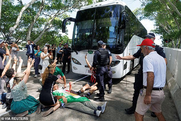 Chaotic stand-off at Australian hotel as protesters try to stop Iranian footballers from flying home and tearful player is ‘dragged onto bus’ after five others were granted asylum
